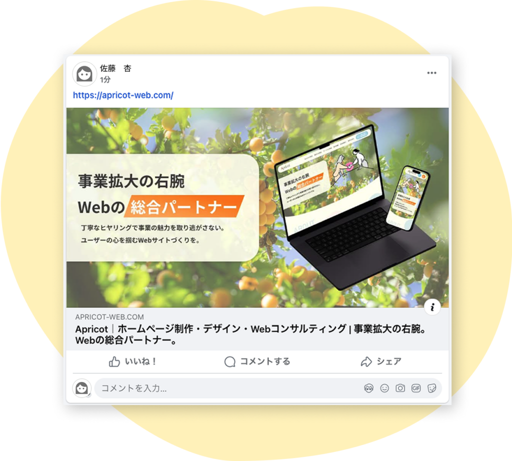 X(旧ツイッター)、Facebook、LINEなどのSNSにWebサイトをシェアする際に出現するカードをデザインいたします。SNSでの見栄えを良くし、アクションの活性化をサポート!